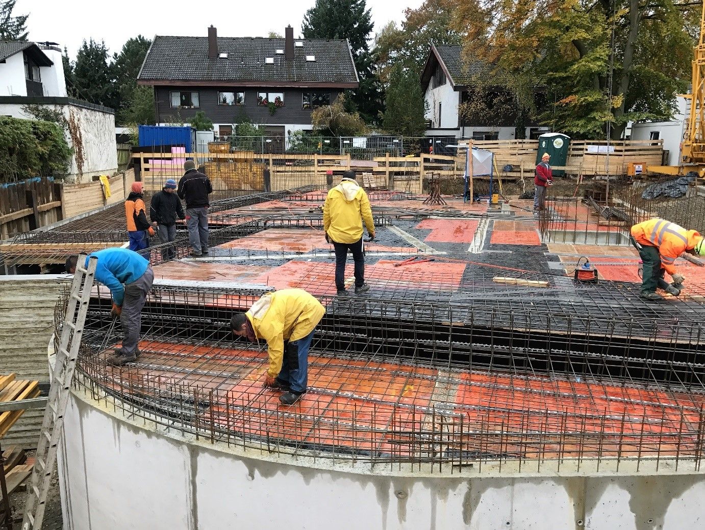 Nachdem der Verbau mit Spunddielen und Kanaldielen eingebracht wurde, wurde die Baugrube hergestellt und der Aushub abtransportiert. Im Moment werden die Arbeiten zur Erstellung des Planums durchgeführt. Danach beginnen die Bewehrungsarbeiten für die Bodenplatte der Tiefgarage.